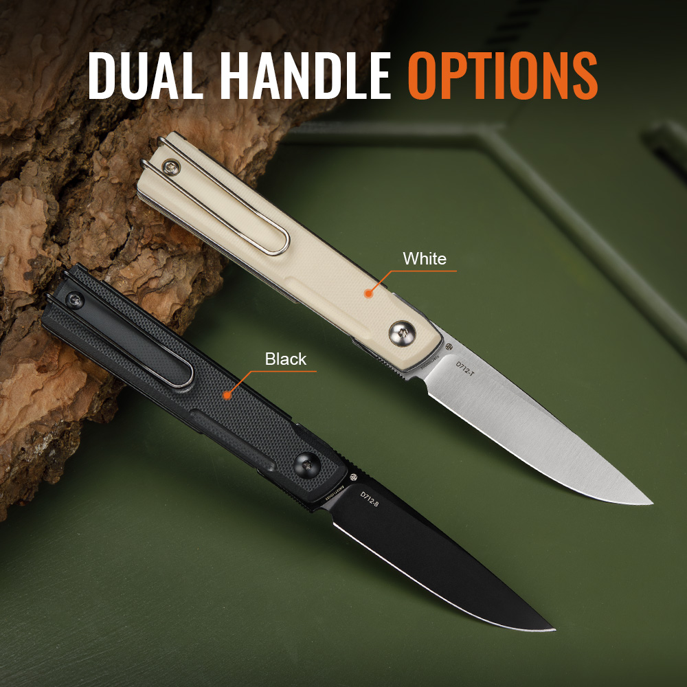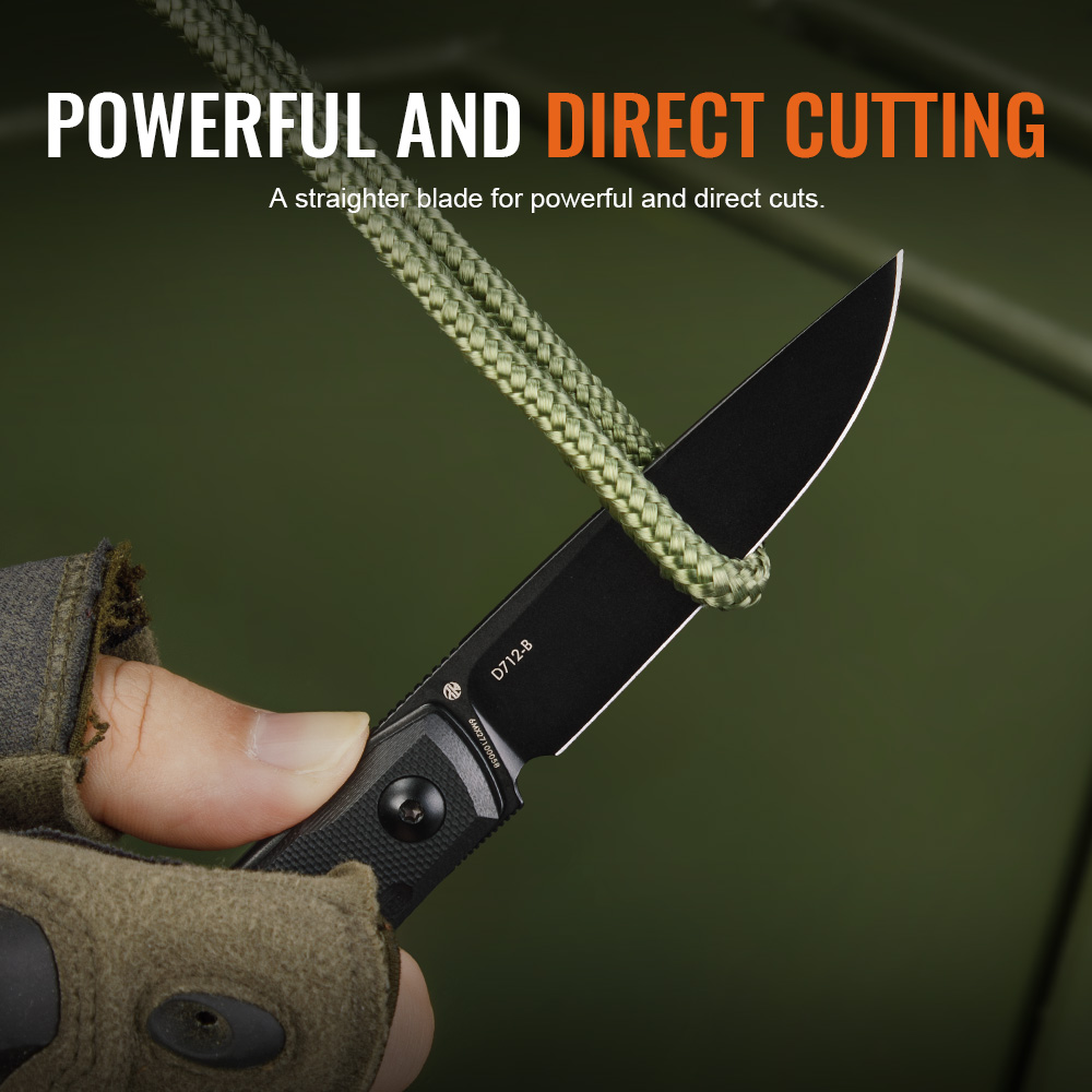 De D712-B heeft een geïntegreerd voeringontwerp dat voor stevigheid zorgt en tegelijkertijd het gewicht en het aantal onderdelen aanzienlijk vermindert voor meer stabiliteit. De onzichtbare flipper verbetert de draagbaarheid en is gekoppeld aan een kogellagersysteem voor een soepele, snelle inzet. Hij is gemaakt van betrouwbaar 8Cr13MoV-staal voor consistente prestaties van de snede.