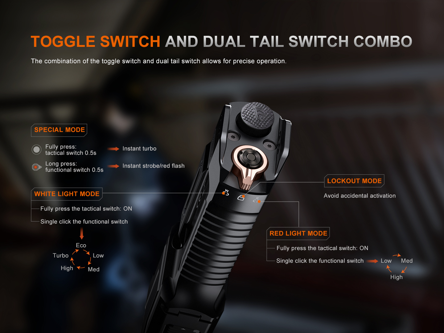 De TK28R is ontworpen voor gemak en betrouwbaarheid en heeft een tuimelschakelaar voor naadloos schakelen tussen de witlichtmodus, de vergrendelings-/uitschakelmodus en de roodlichtmodus, samen met twee achterschakelaars voor Instant Strobe, Instant Turbo of andere functies wanneer dat nodig is. Het break-action mechanisme zorgt voor een snelle vervanging van de batterij. De twee meegeleverde 4000mAh batterijen zorgen voor een verbazingwekkende looptijd tot 102 uur in de Eco-modus. Met IP68 bescherming en 1-meter schokbestendigheid is deze zaklamp perfect voor wetshandhaving, tactische operaties, SAR missies of outdoor avonturen.