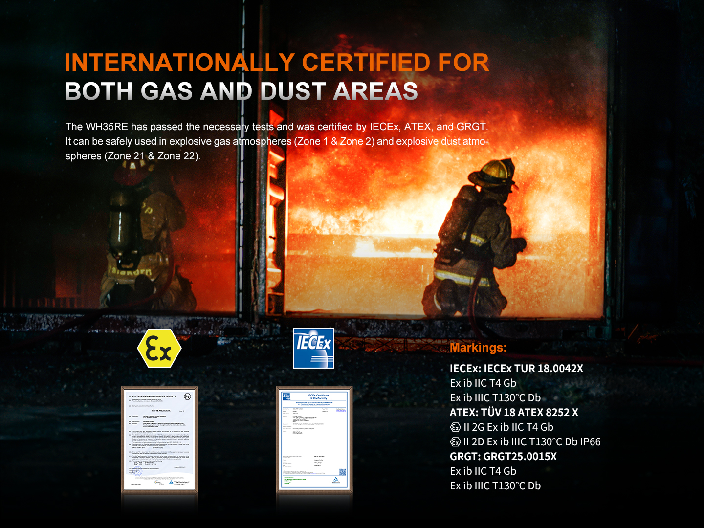 Hij levert een maximale lichtopbrengst van 280 lumen en ondersteunt opladen via USB Type-C. De hoofdlamp kan worden gebruikt als zaklamp wanneer deze is verwijderd uit de houder. De grote schakelaar zorgt voor een eenvoudige en nauwkeurige bediening - zelfs met handschoenen aan. De WH35RE is gecertificeerd door IECEx, ATEX en GRGT. Daarom kan dit product veilig worden gebruikt in explosieve omgevingen die zijn geclassificeerd als Zone 1 en Zone 2, en in gebieden met brandbaar stof die zijn geclassificeerd als Zone 21 en Zone 22. Dit omvat omgevingen zoals aardolie, ATEX en GRGT. Dit omvat omgevingen zoals de aardolie-, chemische en textielindustrie, brandbestrijding, metallurgische gebieden, elektriciteitscentrales en papierfabrieken.